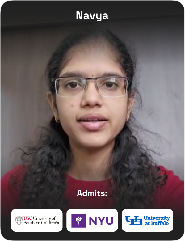 Counsellor Harshitha helped me through the study abroad process for my masters. They supported me by providing guidance on how to write SOPs and LORs, deciding when to write GRE, TOEFL and going through the whole university application process. Received admission from 6 universities, admitted to University of Southern California. I was also guided through the i-20, sevis, visa application process and getting the required documents.